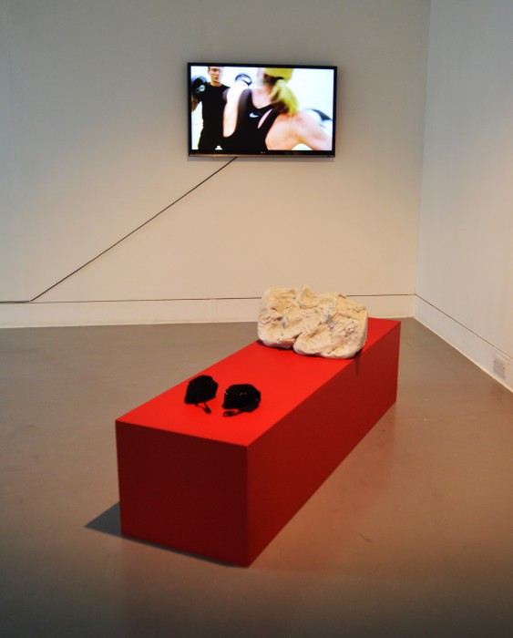 Sculpture, made by performative sculpture making, at The James Hockey Gallery, Farnham, for Farnham Art Society. Boxed, air- drying clay performance, mimicking a women’s professional boxing match. 10 rounds of boxing for 2 mins, with 1 mins rest in between, within a ring, demarcated on the floor (above).